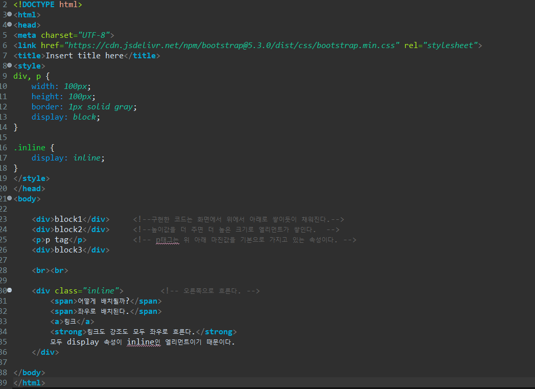 display 속성이 inline인 경우는 우측으로, 그리고 아래쪽으로 빈 자리를 차지하며 흐른다. inline 속성의 엘리먼트는 높이와 넓이를 지정해도 반영이 되지 않는다.