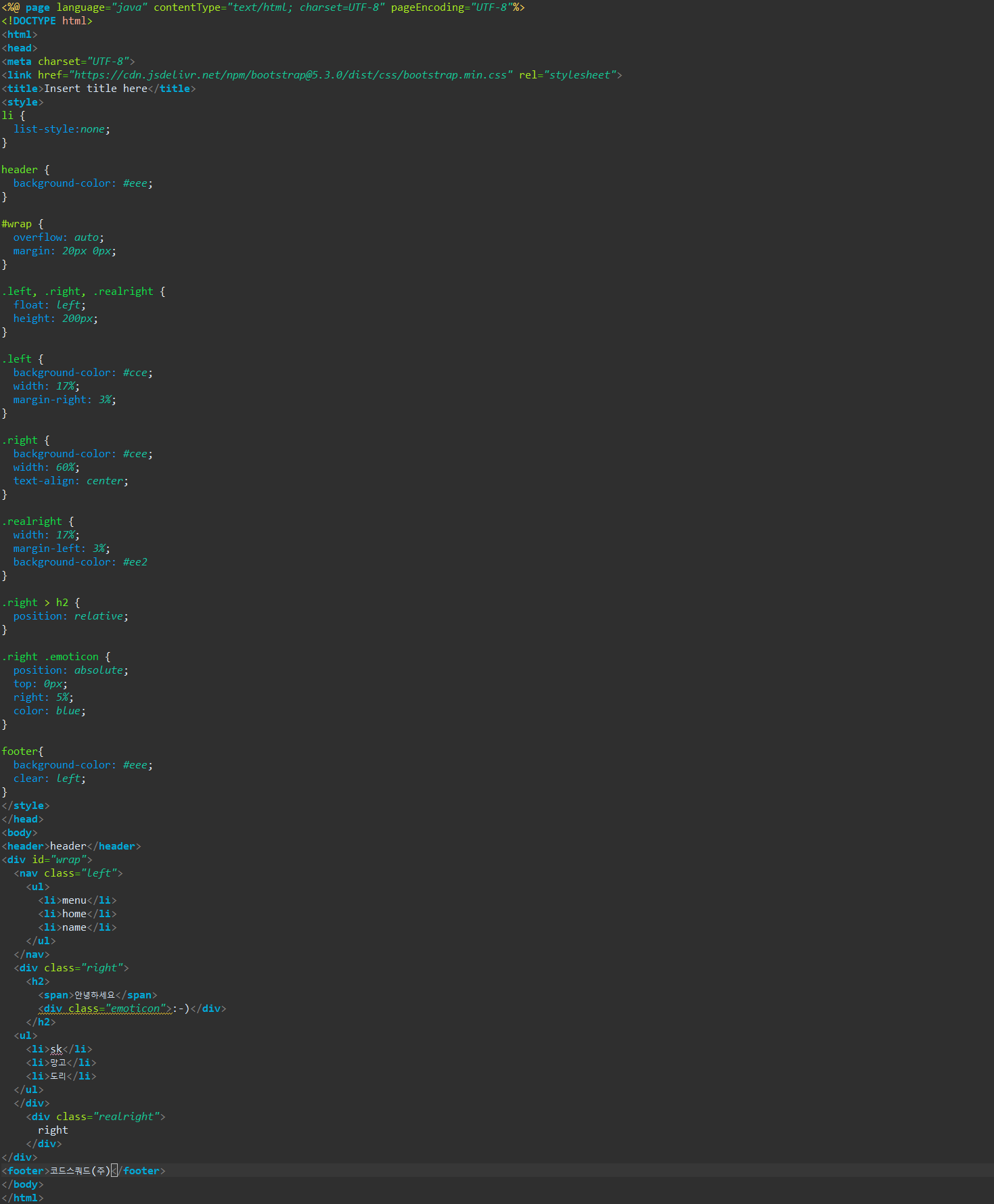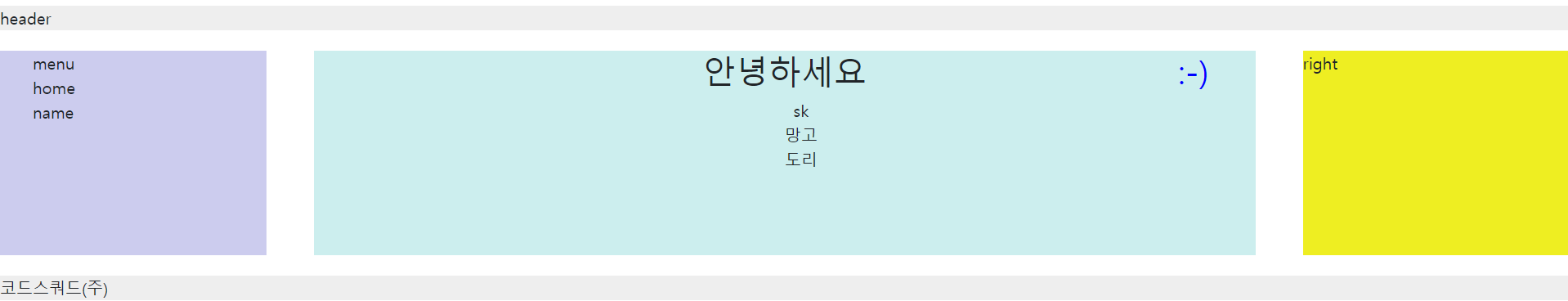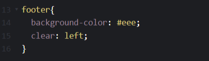 해결방법 : footer에 clear: left; 속성을 줘서 float left 속성을 인식했을 때 올라가지 않도록 해준다. clear: both;를 주면 상위 엘리먼트가 right 또는 left로 되어 있을때 모두 인식해서 올라가지 않도록 해준다.