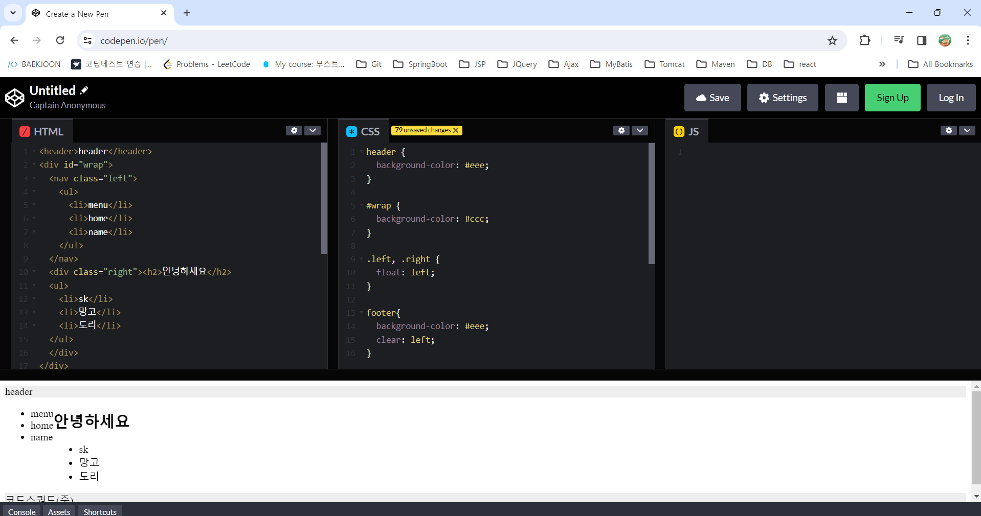 이곳에서 간단하게 html, css를 만들어서 코드를 저장하고 다른 사람들에게 공유할 수 있다.