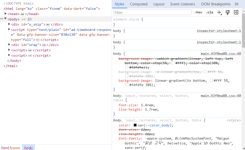 오른쪽에는 해당 엘리먼트가 가지고 있는 style 정보가 나타난다.