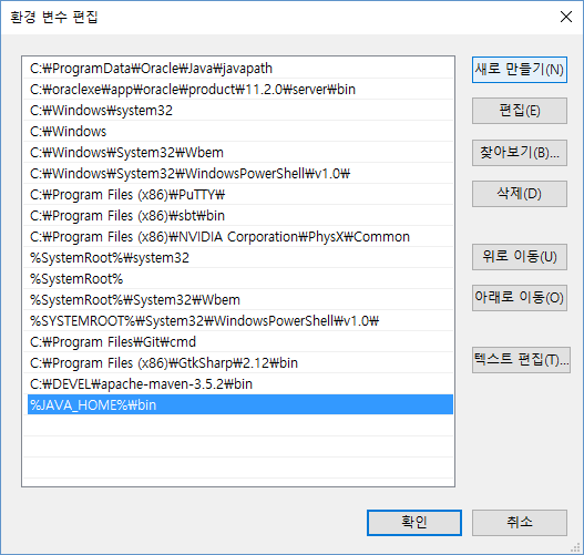 시스템 변수 영역에서 PATH를 찾아서 선택한 후 편집 버튼을 클릭한 후 아래의 그림과 같은 창이 열리면 우측의 새로 만들기 버튼을 클릭 후 %JAVA_HOME%\bin을 입력한다.