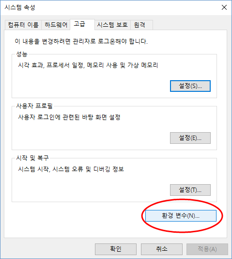 아래와 같은 창이 열리면 환경변수 버튼을 클릭한다.