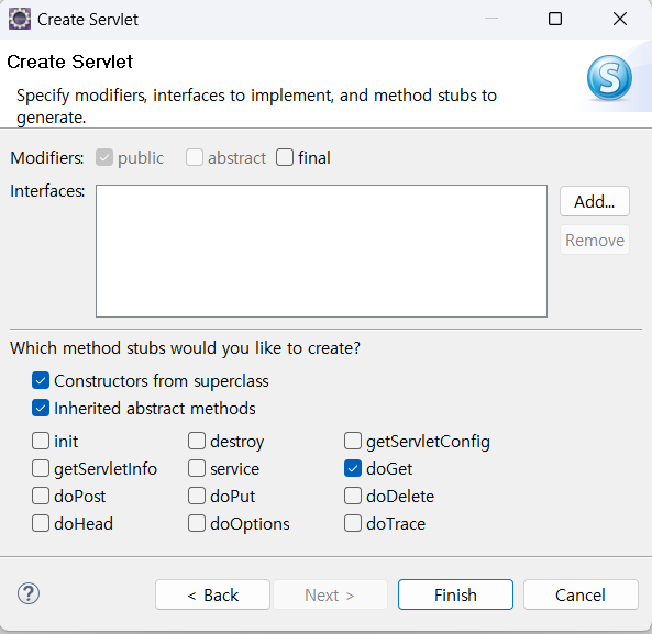 지금은 doGet 메서드만 필요하기 때문에 doGet만 체크한 다음 Finish
