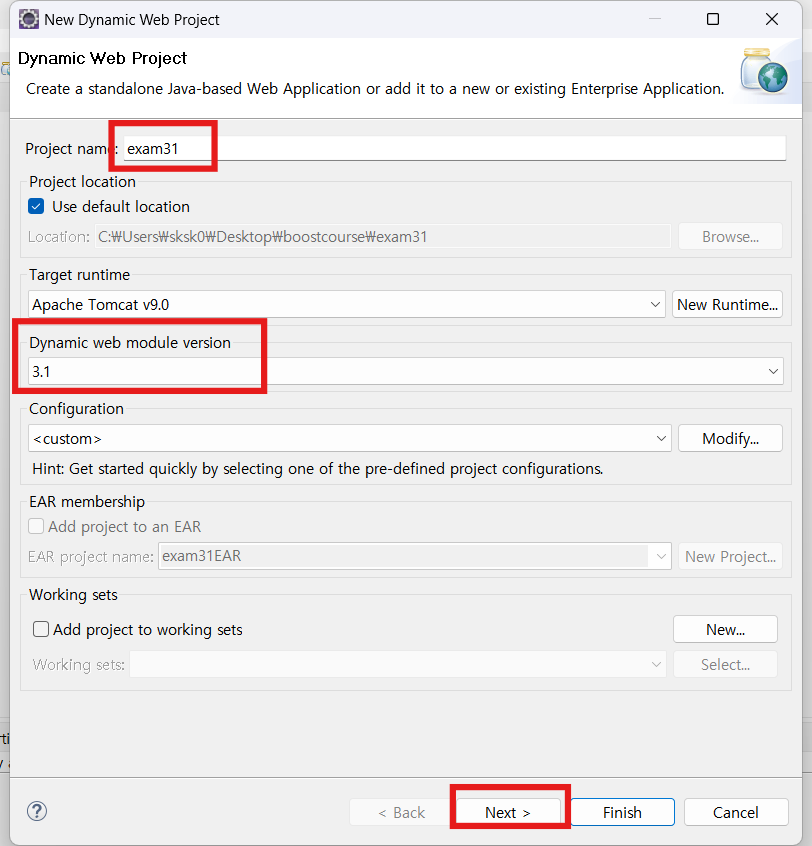 project name을 exam31로 만들어주고 Dynamic web module version을 3.1로 설정해준 다음 Next