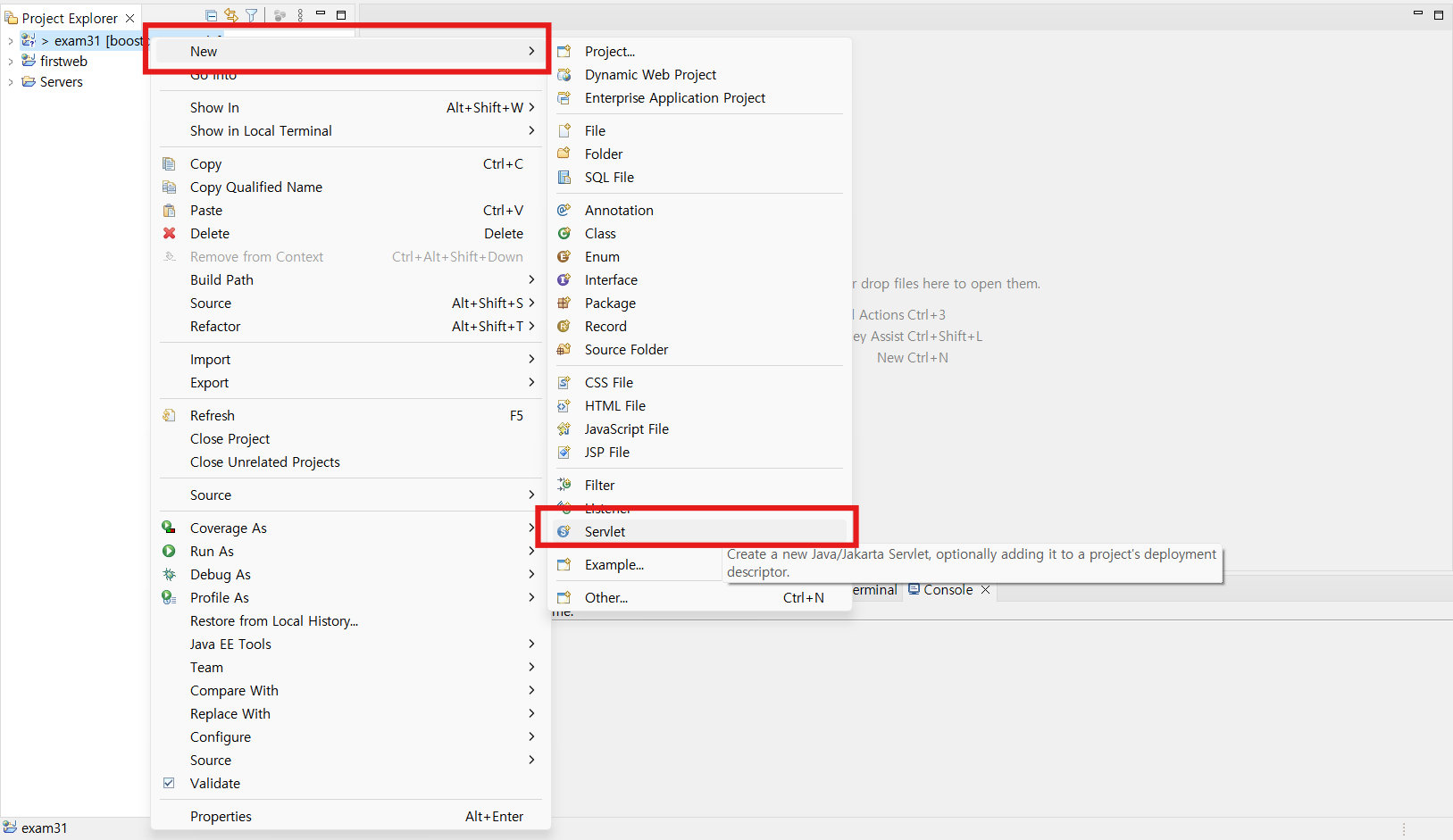 - Servlet 3.1 spec으로 exam31 이라는 프로젝트를 생성