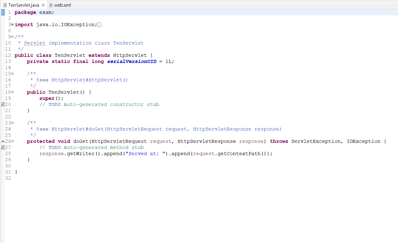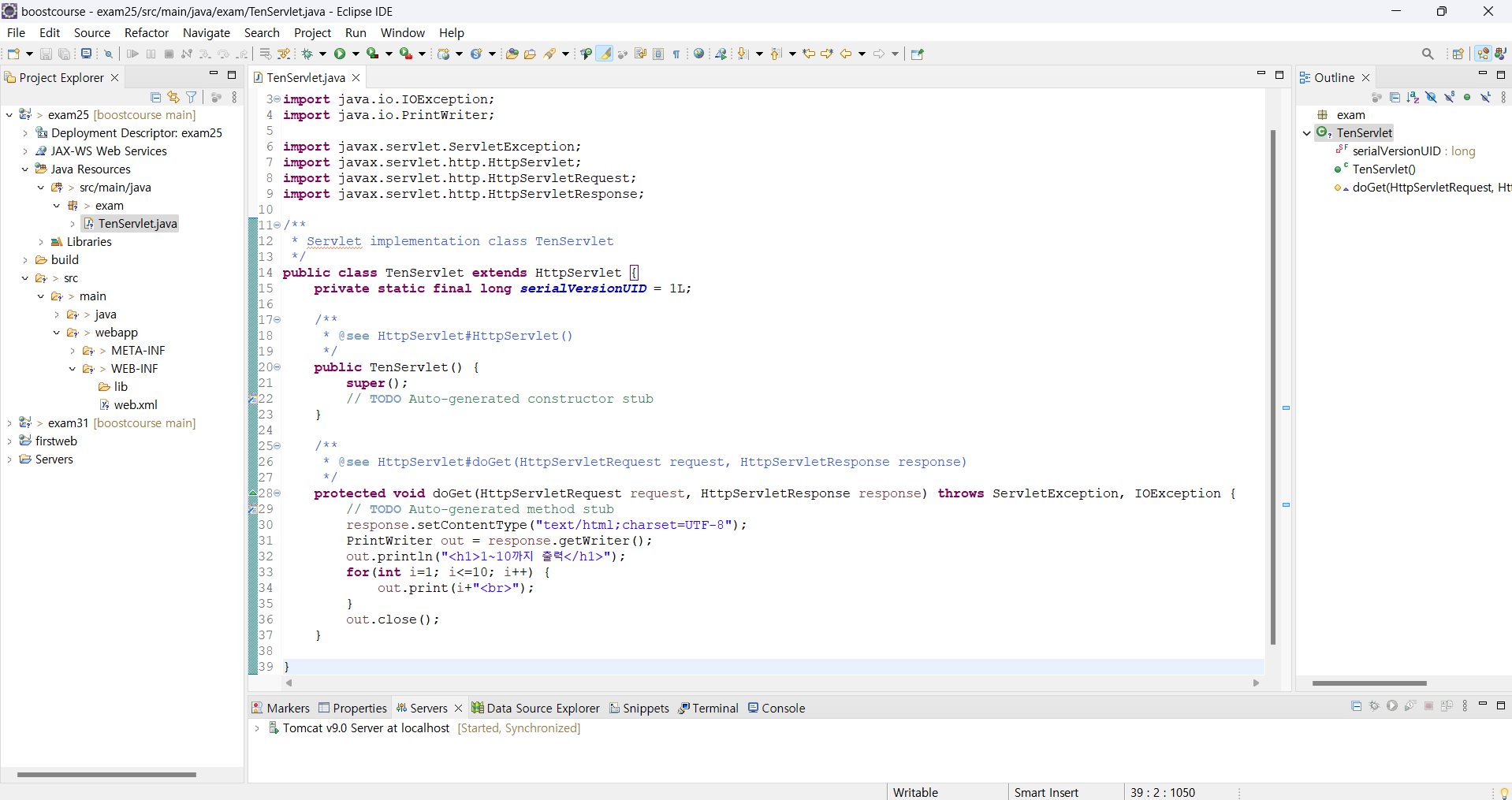 exam25 프로젝트에 Servlet -1 에서 했던 것처럼 똑같이 TenServlet을 만들어준다.