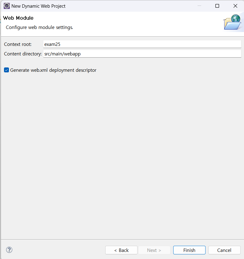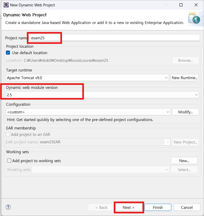 Project name을 exam25 로 만들어주고, Dynamic web module version을 2.5 버전으로 설정해준 다음 Next