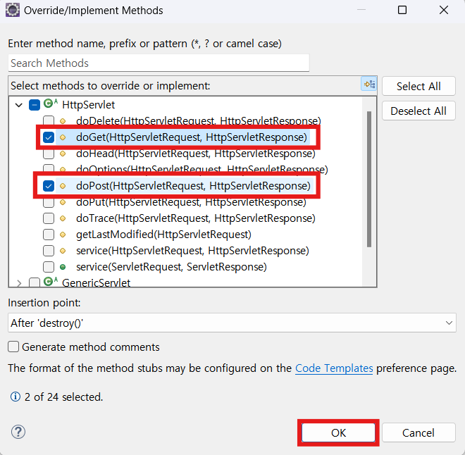 doGet메소드와 doPost메소드 체크한 다음 OK