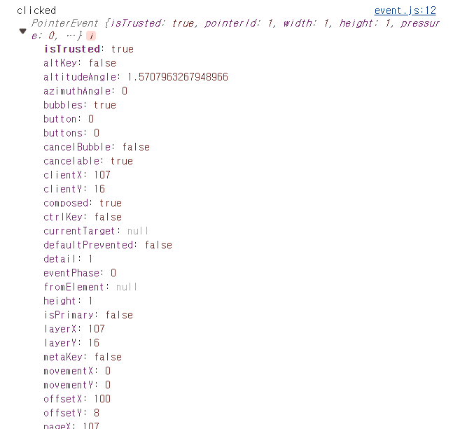 실행하고 console을 보면 엄청 많은 정보가 나온다. 클릭한 지점의 좌표값이 나오기도 하고, 타겟을 보여주기도 한다.