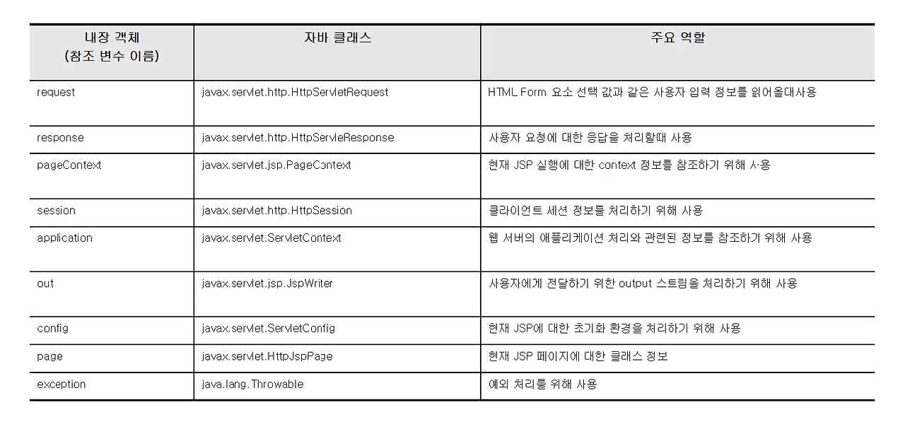 - response, request, application, session, out 과 같은 변수를 내장객체라고 한다.