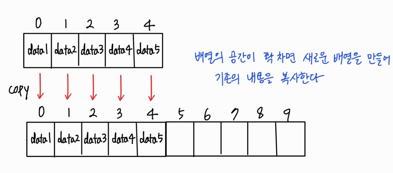 - 생성된 배열의 공간이 꽉 찰 때마다 새로운 배열을 생성하고 copy하는 방식이기 때문에 그 과정에서 지연이 발생한다.