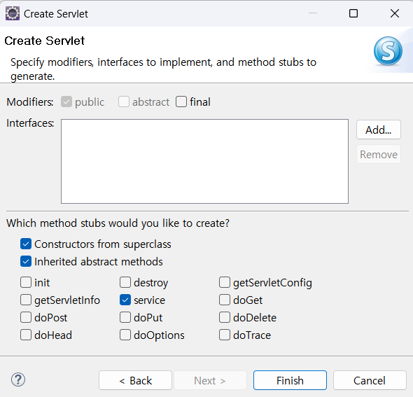 어떤 특정한 방식으로 받아낼건 아니기 때문에 doGet과 doPost는 체크 해제해주고, service만 체크해서 오버라이드 해주 Finish해준다.