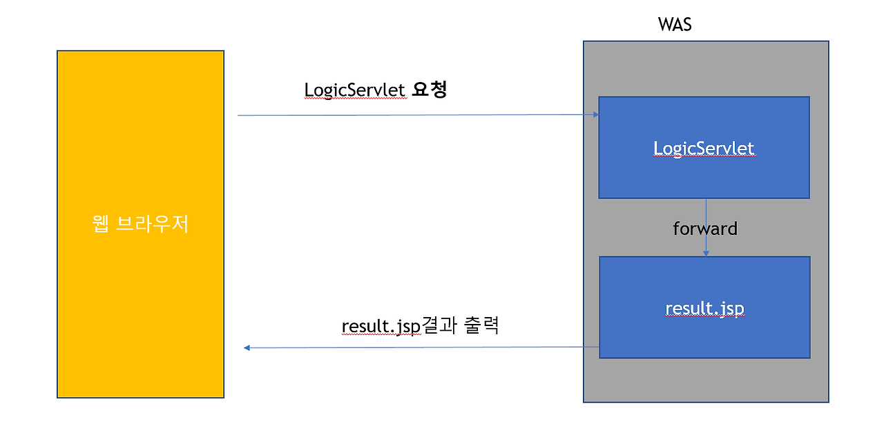 servlet과 jsp의 장단점을 해결하기 위해서 servlet에서 프로그램 로직이 수행되고, 그 결과를 jsp에 forwarding하는 방법이 사용되었다. 이를 servlet과 jsp연동이라고 한다.