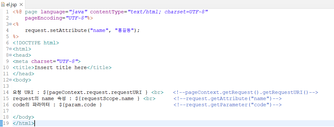| requestScope | request 기본 객체에 저장된 속성의 <속성,값> 매핑을 저장한 Map 객체 |