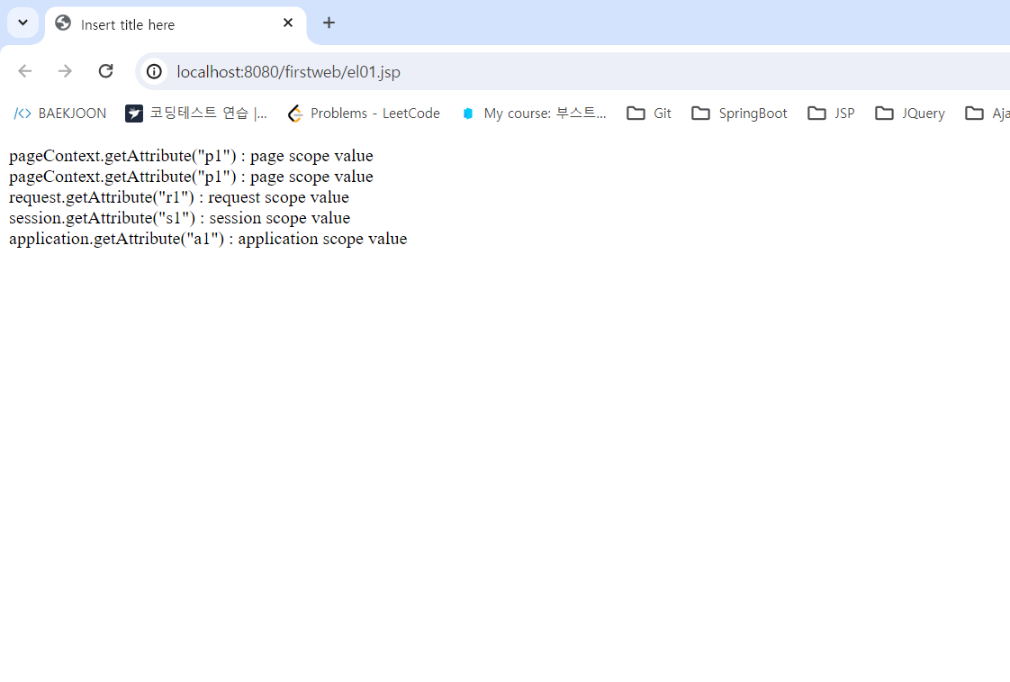 각각 scope의 setAttribute에 저장되어 있는 이름이 겹쳐서 사용되었을 경우에는 명확하게 써줘도 되지만, 겹치지 않을 경우 scope을 생략하고 표기해도 출력 가능하다. 하지만 가급적이면 명시적으로 표현해 주는 것이 효율적일 것이다.
