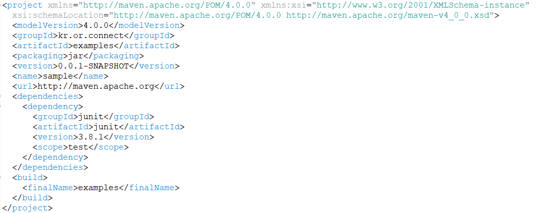 위 예의 경우 빌드할 경우 examples -0.0.1-SNAPSHOT.jar 파일이 생성된다. - packaging : 해당 프로젝트를 어떤 형태로 packaging할 것인지 결정한다. jar, war, ear 등이 해당된다.