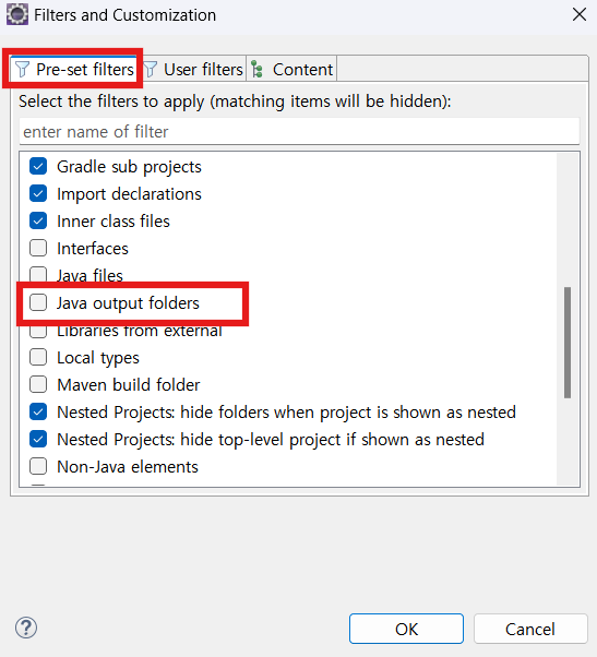 Pre-set filters 탭에서 Java output folders 체크 해제 해준다.