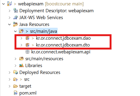 지난번 jdbcexam 프로젝트로부터 패키지 두 개를 가져온다.