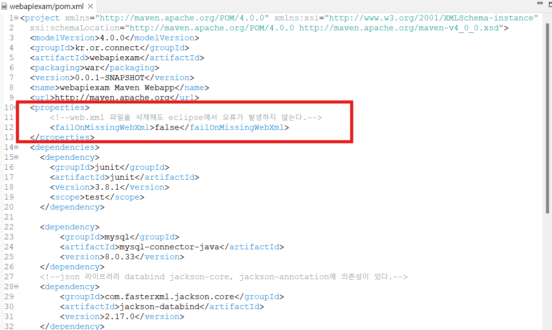 그 다음 pom.xml에 이 부분을 추가해줘야 web.xml 파일을 삭제해도 이클립스에서 오류가 발생하지 않는다.