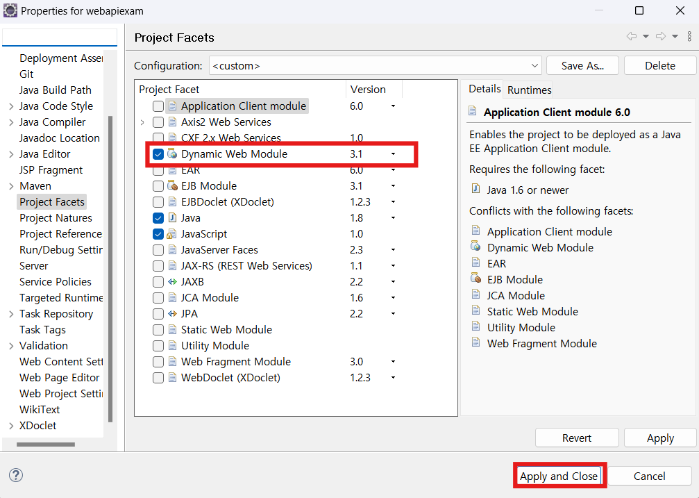 Maven > Project Facets 에서 Dynamic Web Module을 3.1로 맞춰주고 Apply and Close해준다.