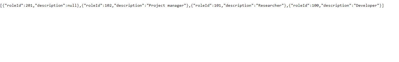 jdbc 소스에서 role에 대한 데이터를 가져오고, 가져온 것을 json형태로 바꾸어서 응답결과로 보내면 보낸 응답 결과가 출력된다.