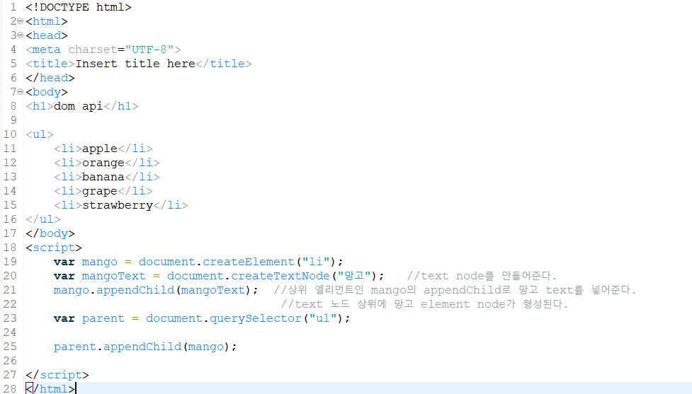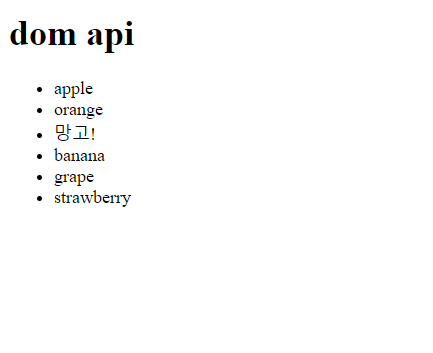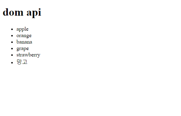 1) DOM API를 사용해서 strawberry 아래에 새로운 과일인 망고를 추가하기