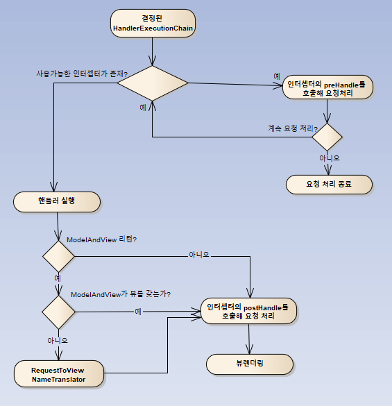 - 핸들러 어댑터는 선택된 핸들러를 실행하는 방법과 응답을 ModelAndView로 변화하는 방법에 대해 알고 있다.