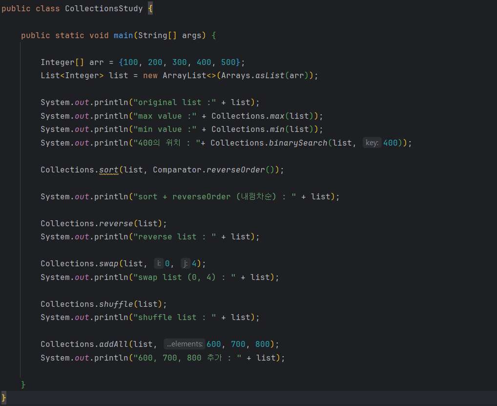 정렬(sort), 섞기(shuffle), 탐색(binarySearch) 등 유용한 기능을 제공한다.